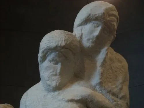L'œuvre est composée de deux figures fantomatiques presque dépourvues de traits du visage ; des visages allongés symbolisant un cri silencieux enveloppé de douleur. C'est le dernier adieu, presque la prémonition d'un artiste capable de donner vie au marbre, de faire frémir ses sculptures au ciseau, de redonner de la splendeur à l'Église avec ses œuvres titanesques... Les mêmes qui ont subi la profanation de la censure.